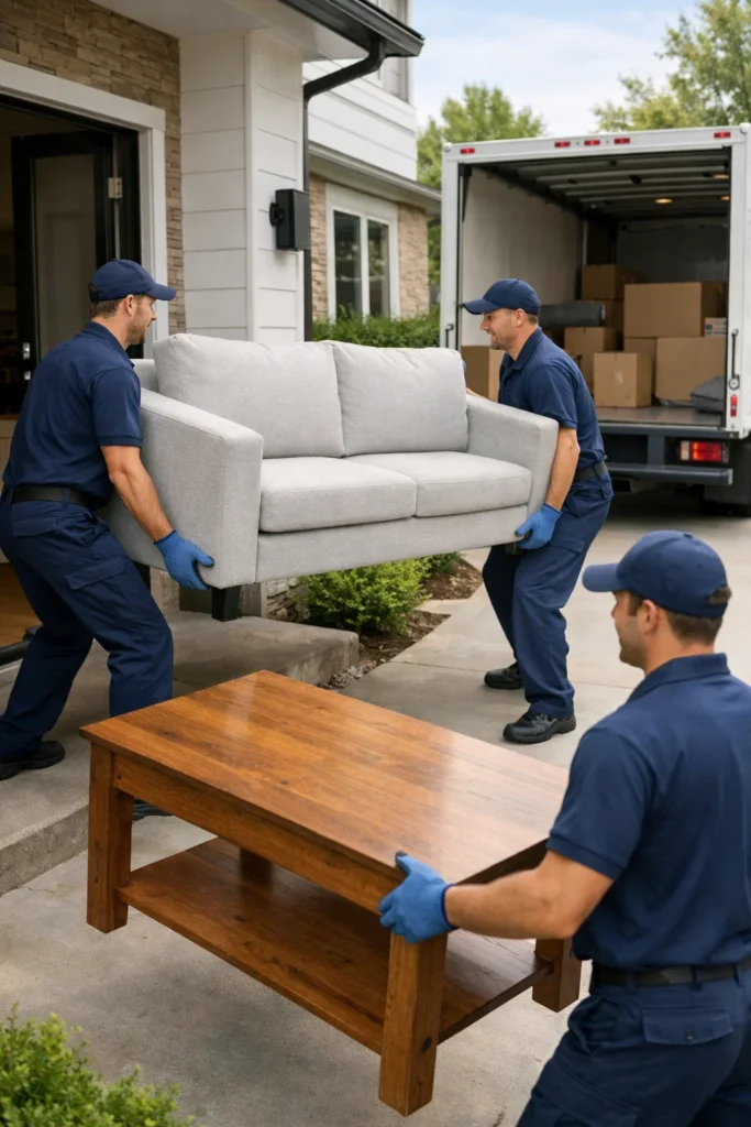 Heavy furniture is lifted and moved carefully to protect floors, doors, and surrounding areas.